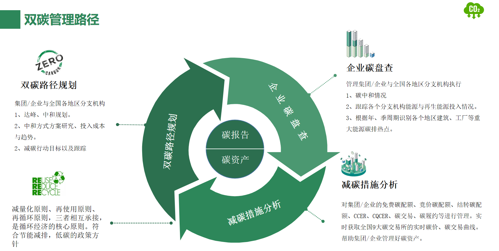 通過清潔能源、用能保障、儲(chǔ)備等方面分析園區(qū)、集團(tuán)在能源保障、碳中和路徑和碳趨勢(shì)的預(yù)測(cè);