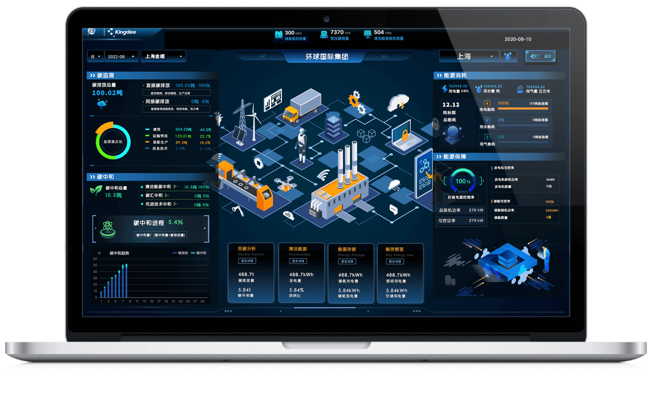 雙碳綜合分析,能耗費(fèi)用、碳排放量、碳排強(qiáng)度、增長比例、清潔能源裝機(jī)容量、分布定位等各方面的一屏展示。