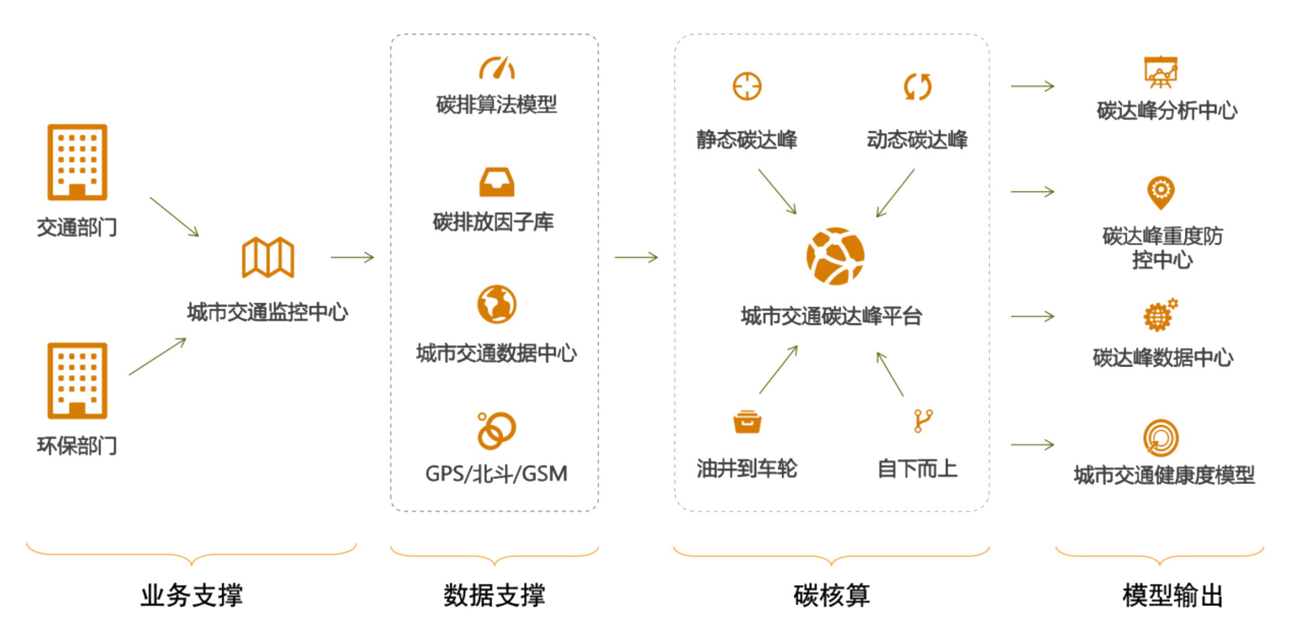如圖-重貨零碳業(yè)務(wù)架構(gòu)層所示,從業(yè)務(wù)支撐包括交管部門、環(huán)保部門以及其他周邊更多部門(根據(jù)具體擴(kuò)展情況,如核查部門、質(zhì)量監(jiān)管部門等)為基礎(chǔ)管理單位成立交通重貨推進(jìn)小組,并在此基礎(chǔ)之上,通過軟硬結(jié)合的方式,建立城市交通碳達(dá)峰平臺(tái)。