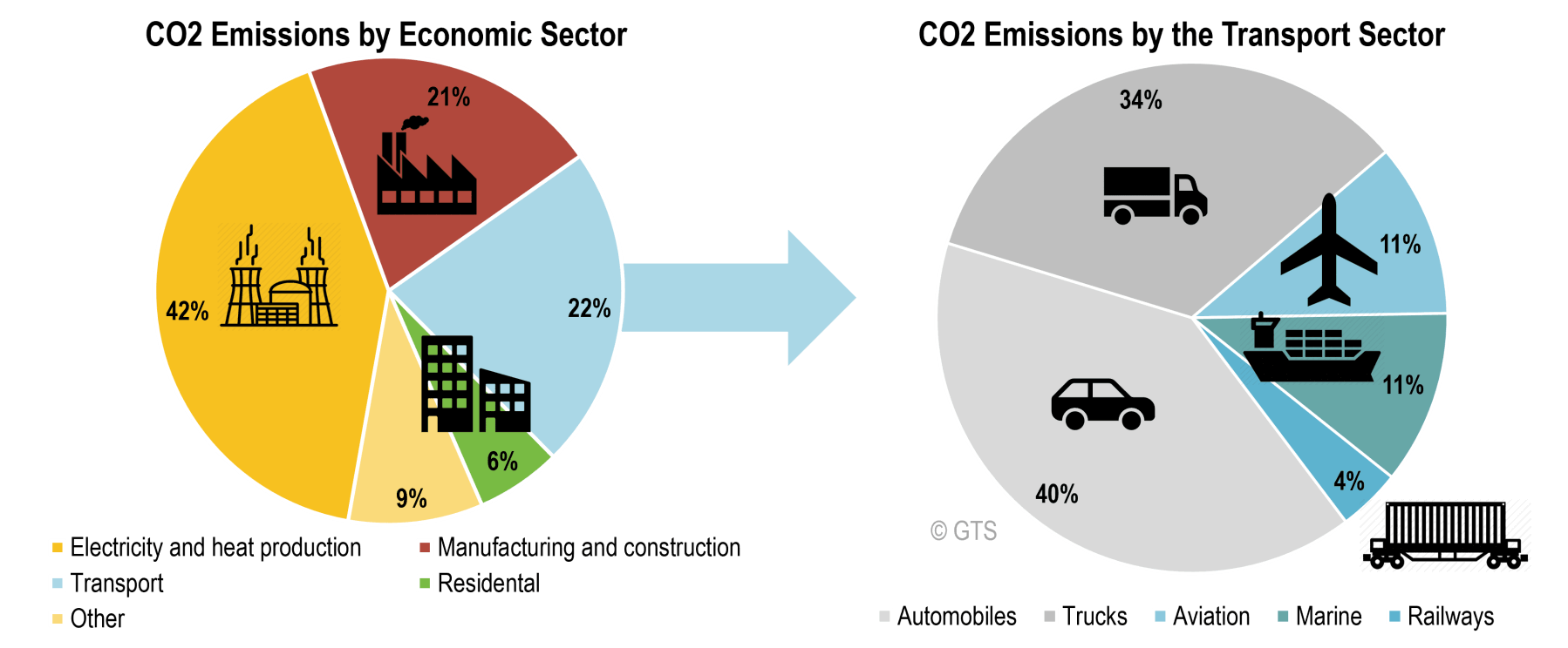 交通運(yùn)輸約占溫室氣體排放量的 20%,其中公路運(yùn)輸占四分之三。航空和海運(yùn)分別占11%。每種主要的交通方式都需要自己的緩解策略。